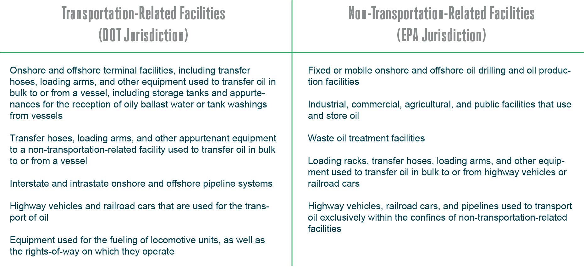 For facilities that can be both transportation-related and non-transportation-related, activities are subject to both EPA and DOT or USCG jurisdictions. Facilities in this situation need to evaluate the activities carefully to determine the correct jurisdiction.