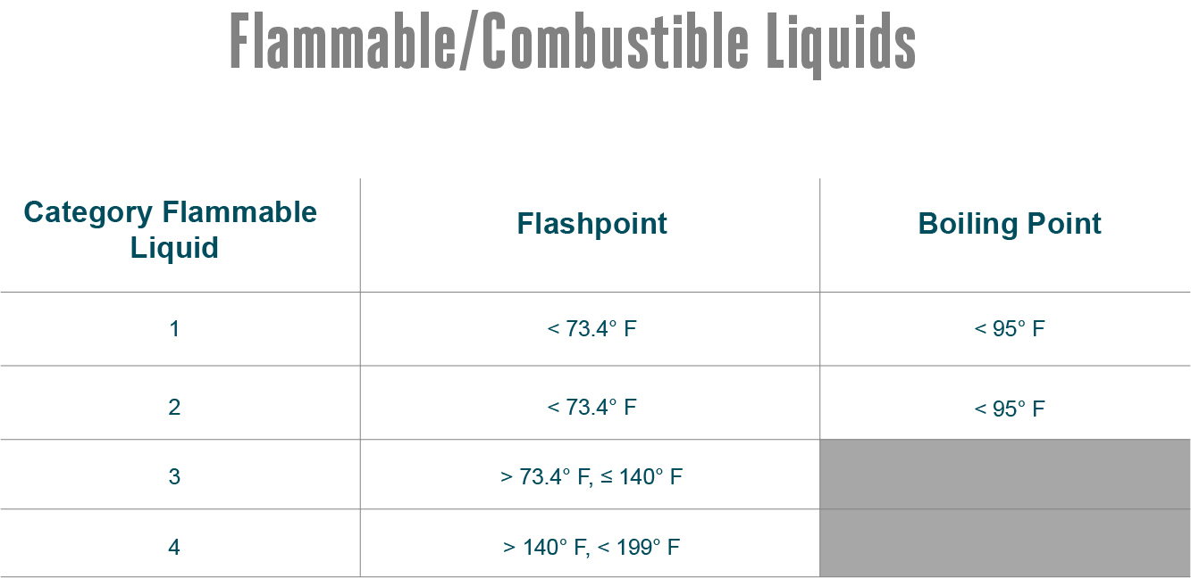 Improper storage of flammable liquids can also pose a significant risk to your business. OSHA’s flammable liquid standard 29 CFR 1910.106 limits the amount of flammable liquids that can be stored outside a flammable storage room or cabinet. OSHA divides flammable liquids into four categories: Categories 1, 2, 3, and 4. See the table below for more information.