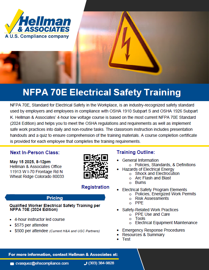 NFPA 70E, Standard for Electrical Safety in the Workplace, is an industry-recognized safety standard used by employers and employees in compliance with OSHA 1910 Subpart S and OSHA 1926 Subpart K. Hellman & Associates’ 4-hour low voltage course is based on the most current NFPA 70E Standard (2024 Edition) and helps you to meet the OSHA regulations and requirements as well as implement safe work practices into daily and non-routine tasks.
