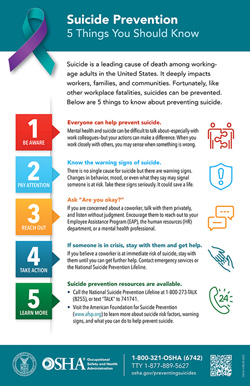 Click here to download OSHA’s Suicide Prevention guide.Resources are also available at the 988 Suicide & Crisis Lifeline (formerly the National Suicide Prevention Lifeline). It provides free and confidential emotional support to people in suicidal crisis or emotional distress 24/7 in the U.S. The Lifeline is comprised of a national network of over 200 local crisis centers, combining local care and resources with national standards and best practices.