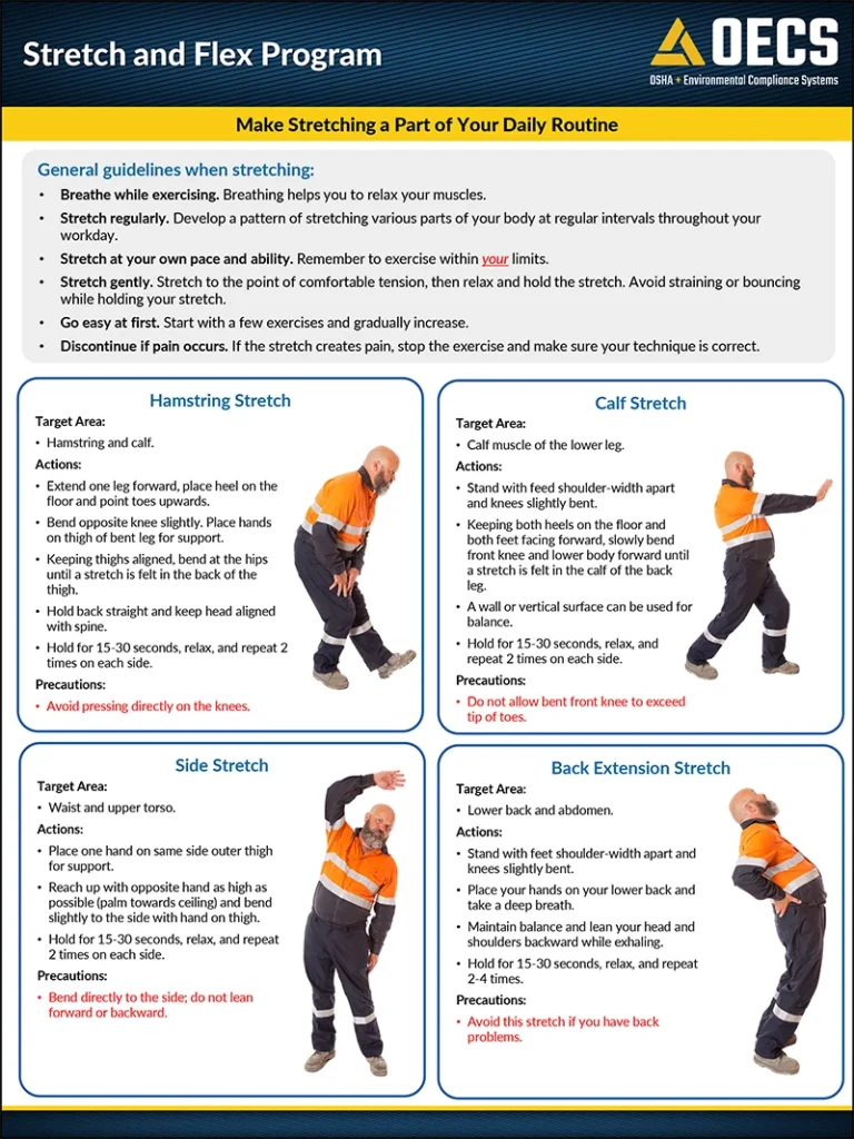 Improve workplace safety and boost your team’s well-being with our Free Ergonomic Flex & Stretch Handout! This downloadable PDF is packed with simple, effective stretches and ergonomic tips that should be done throughout the day. Created by safety experts, this guide is designed to reduce strain, prevent injury, and keep your team feeling energized throughout the workday.